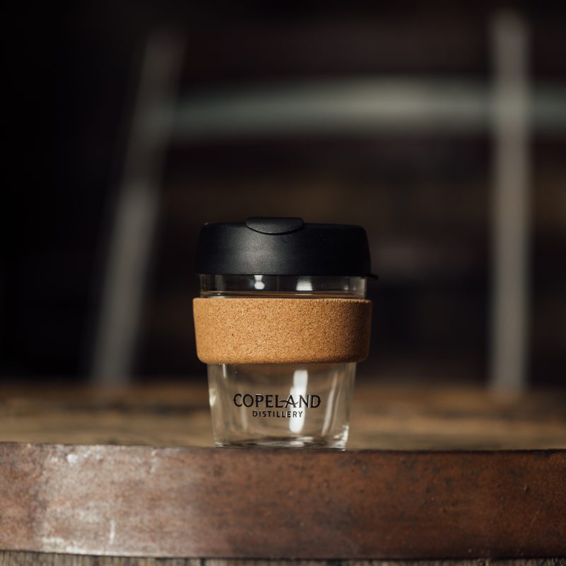 Tempered glass KeepCup with Copeland Distillery branding, finished with a natural cork band for comfort and style. Use with the splashproof lid on the go, or go lid-free as a premium glass tumbler.