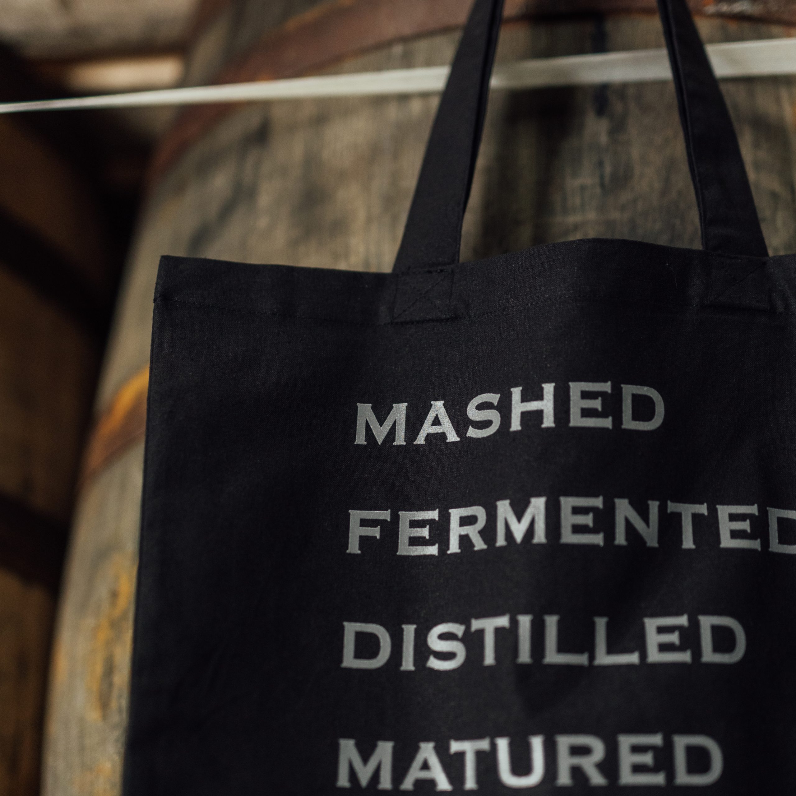 Copeland Distillery Whiskey Tote Bag, 100% cotton with “Mashed, Fermented, Matured, Bottled, Donaghadee” on the front and a plain back. Durable, stylish, and perfect for everyday use.